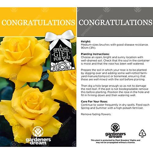 A Congratulations Rose is the perfect gift to compliment a cause for celebration. Yellow roses are a symbol of joy and delight which make them an ideal gift for commemorate a special achievement, whether it be an engagement, passing an exam or a promotion. Make it something to remember.Rose bouquets can be expensive, considering they will last a week or so; a living GardenersDream rose will flourish for years to come.All of our gift roses are potted and presented with a large, attractive colour label with a picture and care instructions. We’ll also include a small personalised gift card on which you can write any special message you wish to include with your rose.GardenersDream Gift Rose Collection features an abundance of vibrant colours for celebratory, commemorative and congratulatory occasions; wedding roses, birthday roses, anniversary roses, retirement roses, Mother’s Day roses and more.