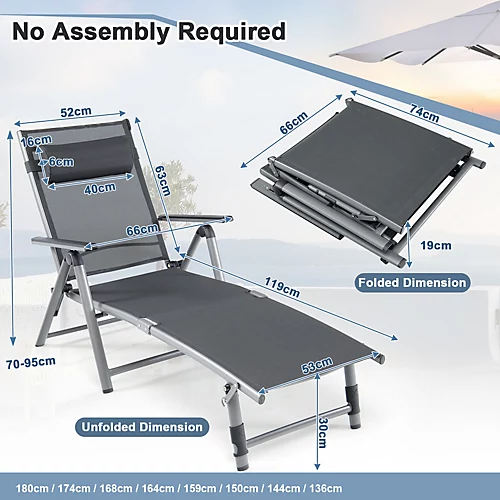 - No Installation Required: This outdoor aluminum chaise lounge chair is not needed to assemble, which greatly saves your precious time and energy. Overall dimension of unfolding: 180/174/168/164/159/150/144/136 x 66 x 70/74/79/83/87/90/93/95 cm (L x W x H), overall dimension of folding: 74 x 66 x 19 cm (L x W x H). Please refer to the size instructions before purchasing to avoid unnecessary trouble.