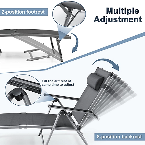 - Quick-drying Fabric: To make your leisure time not have to wait after the rain, this patio folding chaise is made of quick-drying fabric that is also breathable, letting you have a cozier lying experience. And the pillow is adjustable and removable so that you can use it as a headrest or lumbar pillow as your wish.