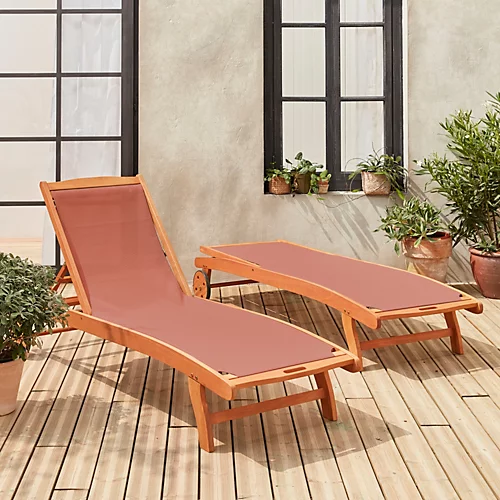 Multi position sun loungers with castersPre oiled FSC certified wood!Created in wood and textilene the Marbella deck chairs have a lovely contemporary design. They are perfect for modern terraces. These practical chairs are equipped with wheels for easy movement. The multi position backrest adapts to your needs and offers you relaxation and comfort.The Marbella deck chairs are strong and well suited to outdoor use. In fact the textilene is not affected by the weather and the material hugs your body while letting it breathe on hot days. The wood is eucalyptus sourced from FSC certified plantations in Uruguay. It is a resistant and durable wood. It is covered with a tinted oil which protects it while leaving a hue that is as close to natural as possible.Technical specifications:Uruguayan eucalyptus is completely dried after cutting then sanded and treated with a protective oil.Assembly with mortises and tenons and galvanised hardware.These FSC wood products have been manufactured in an environmentally friendly way and guarantee sustainable forest management.Polyester textilene (PVC coated fibres) UV and weather resistant.Fabric material: TextileneFrame material: Eucalyptus2 sun loungers: L196 x W70 x H46/90.5cmMaximum weight supported: 110 kgSeat height: 34 cm