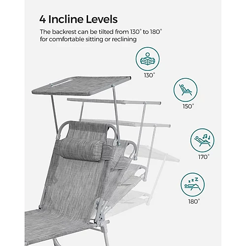 - NO DAZZLING SUNSHINE: Let the sunshine warm your skin but not burn your eyes. Thanks to the adjustable sunshade of this sun chair, you can read your magazines without being dazzled. As the sun turns, simply push the sunshade to to adjust it
